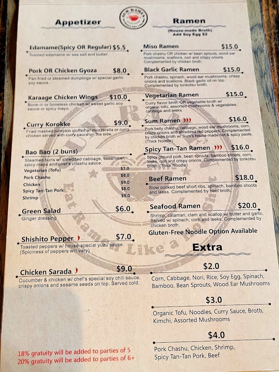 From a reviewer’s perspective, the menu at Sum Ramen delivers a well-rounded and thoughtfully curated experience that highlights both comfort and creativity. The heart of the menu clearly lies in the ramen selection, built on rich house-made broth and elevated by standout options such as LIMITED SPECIAL: Kimchi Pork Ramen, Seafood Ramen, Sum Ramen Spicy Tan Tan Ramen, and the highly anticipated LIMITED SPECIAL: WONTON RAMEN. Each bowl feels purposeful, offering depth, balance, and variety for both traditional ramen lovers and those seeking bolder flavors. Complementing the noodles, the side orders-Chicken, Chashu Pork, Rice, Nori, and Shrimp-allow diners to customize their meal or add satisfying extras without overwhelming the main dishes.