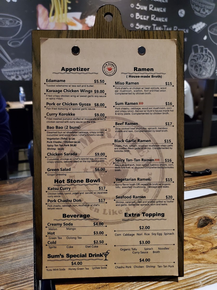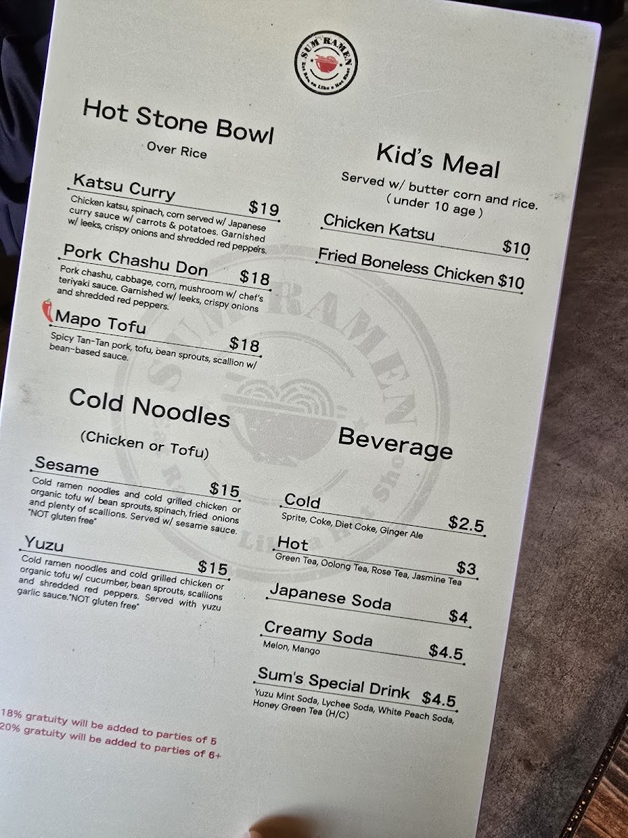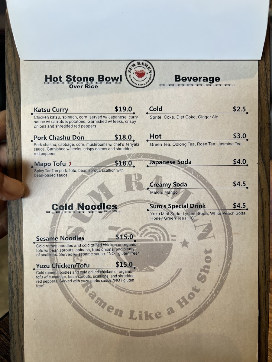 Beyond ramen, the Hot Stone Bowl section adds warmth and comfort with hearty choices like Pork Chashu Don, Katsu Curry, and Mapo Tofu, each served sizzling and flavorful. For lighter or seasonal cravings, the Cold Noodles category shines, especially with SUMMER SPECIAL: Tan-Tan Mazemen, SUMMER SPECIAL: Sum’s Tea Noodles, Yuzu Cold Noodles, and Sesame Cold Noodles, which bring refreshing textures and bright flavors to the table. The experience is further enhanced by a diverse beverage lineup, including Creamy Soda, Japanese Marble Soda, Juice, Sum Tea (Boba Series), and Sum’s Special Drink, perfect for pairing with both spicy and savory dishes. Finally, the appetizers-such as Karaage Chicken Wings, Green Salad, Wonton Appetizer, Chicken Sarada, and Edamame-round out the menu with shareable starters that set the tone for a satisfying meal. Altogether, Sum Ramen’s menu feels cohesive, flavorful, and well-balanced, making it a memorable destination for ramen and Japanese comfort food enthusiasts.