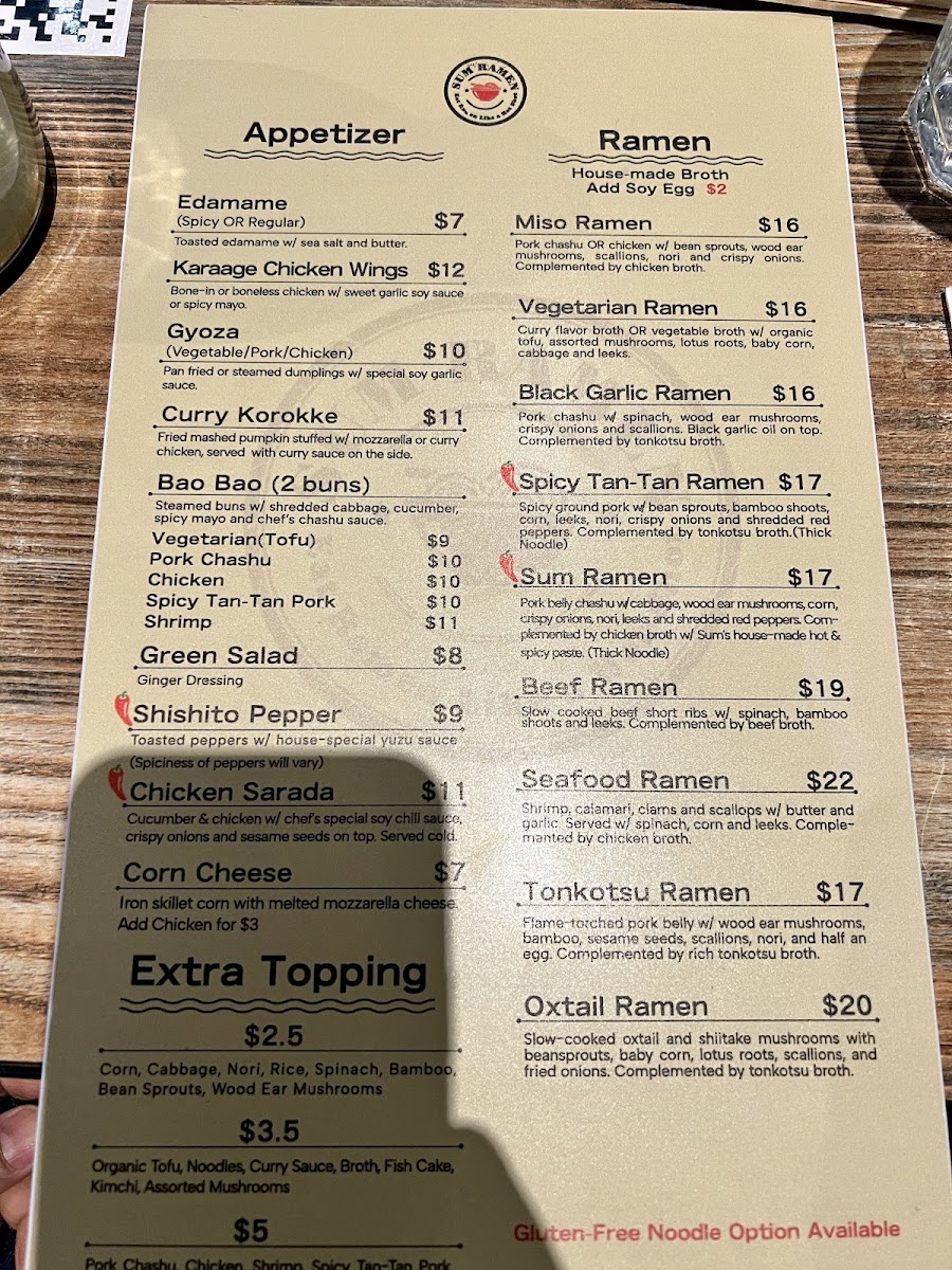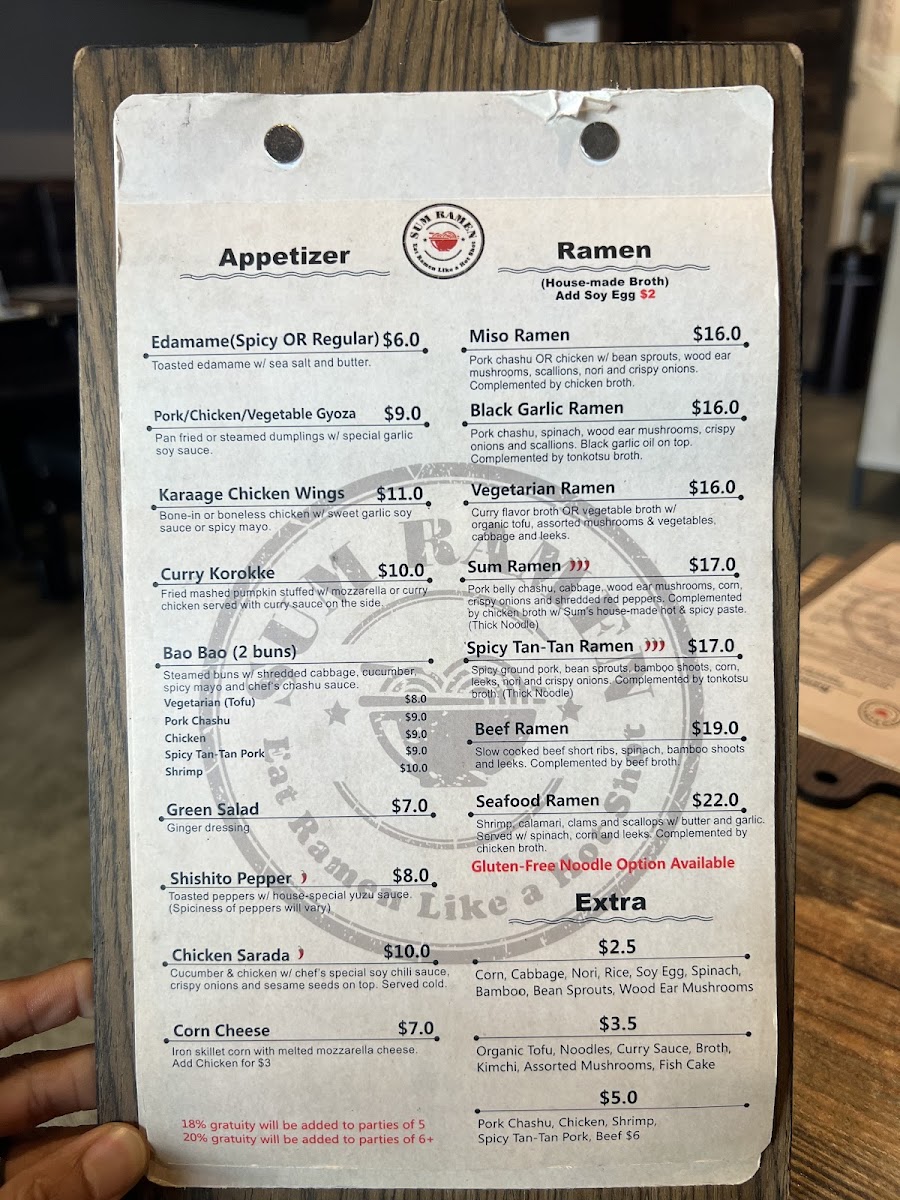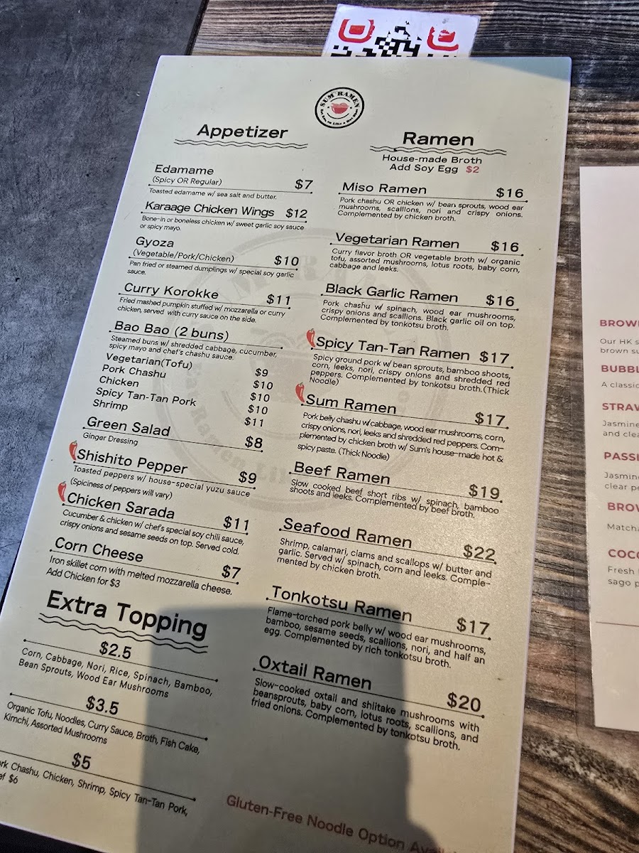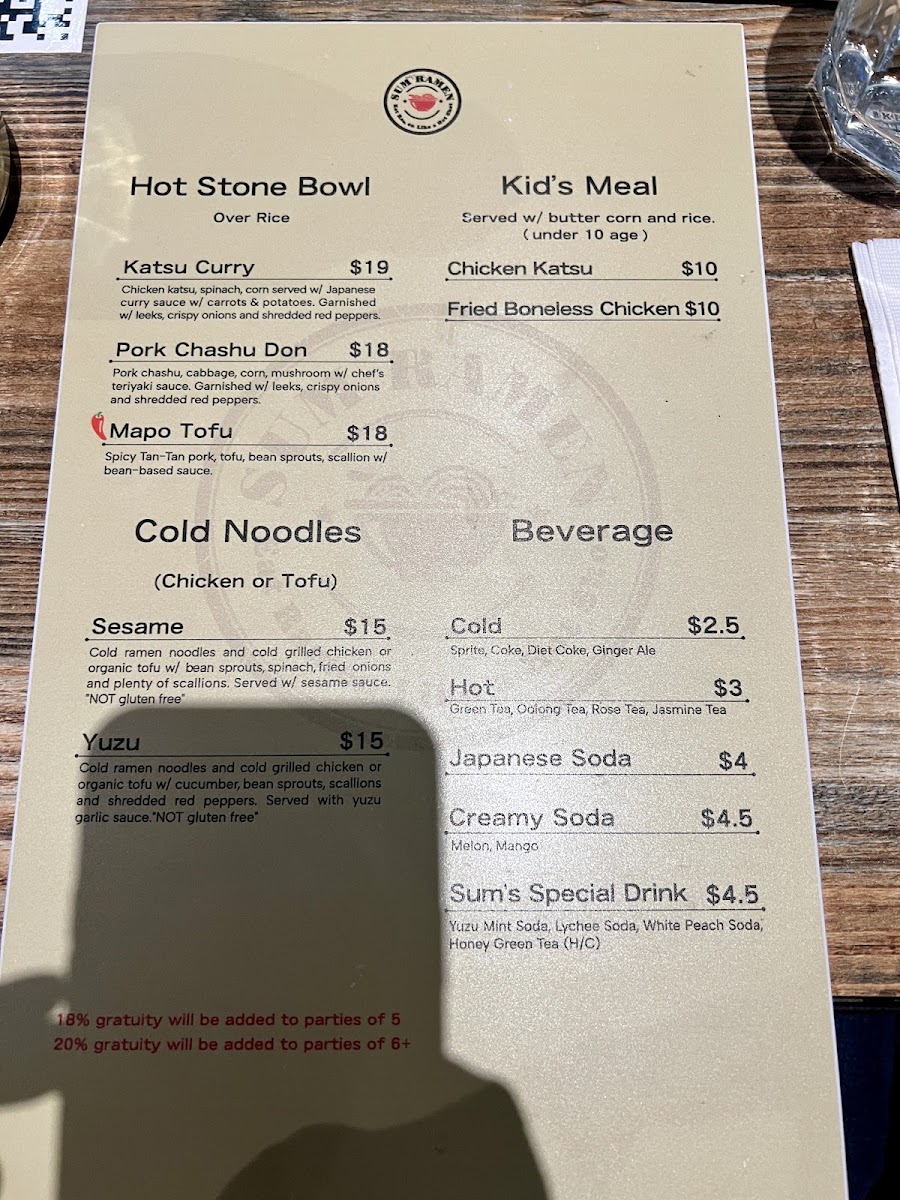 Beyond ramen, the Hot Stone Bowl section adds warmth and comfort with hearty choices like Pork Chashu Don, Katsu Curry, and Mapo Tofu, each served sizzling and flavorful. For lighter or seasonal cravings, the Cold Noodles category shines, especially with SUMMER SPECIAL: Tan-Tan Mazemen, SUMMER SPECIAL: Sum’s Tea Noodles, Yuzu Cold Noodles, and Sesame Cold Noodles, which bring refreshing textures and bright flavors to the table. The experience is further enhanced by a diverse beverage lineup, including Creamy Soda, Japanese Marble Soda, Juice, Sum Tea (Boba Series), and Sum’s Special Drink, perfect for pairing with both spicy and savory dishes. Finally, the appetizers-such as Karaage Chicken Wings, Green Salad, Wonton Appetizer, Chicken Sarada, and Edamame-round out the menu with shareable starters that set the tone for a satisfying meal. Altogether, Sum Ramen’s menu feels cohesive, flavorful, and well-balanced, making it a memorable destination for ramen and Japanese comfort food enthusiasts.