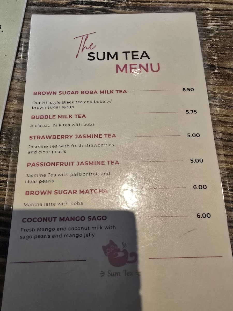 Sum's menu of highly requested boba teas or fruit mixes! Brown Sugar Boba Milk Tea - Our HK style Black tea with black boba w/ brown sugar syrup and whole milk. Bubble Milk Tea - Classic milk tea with black boba and whole milk. Brown Sugar Matcha Latte - Matcha latte with whole milk, black boba, and brown sugar syrup. Coconut Mango Sago - Mango and coconut milk with sago pearls, mango jelly. Strawberry Jasmine Tea - Jasmine tea with fresh strawberries and clear pearls. Passionfruit Jasmine Tea - Jasmine tea with passionfruit and clear pearls.